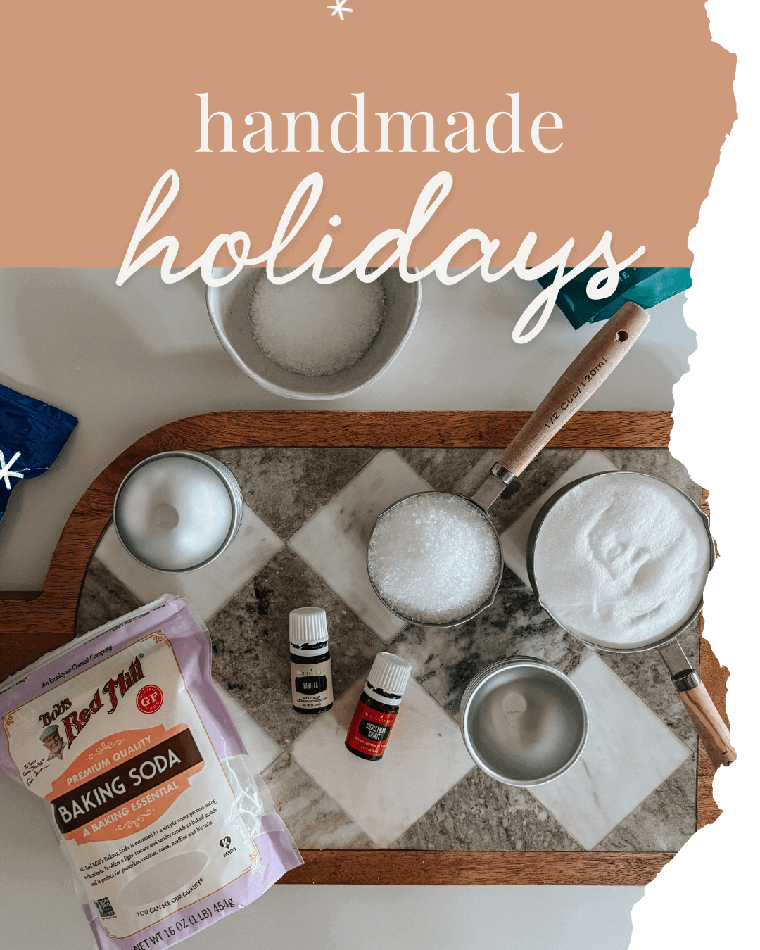 Combine ½ cup sugar + ¼ cup coconut oil + 5 drops Peppermint + 5 drops Vanilla. Use after a day of baking or prepping for guests! - Winter Simmer Pot:
